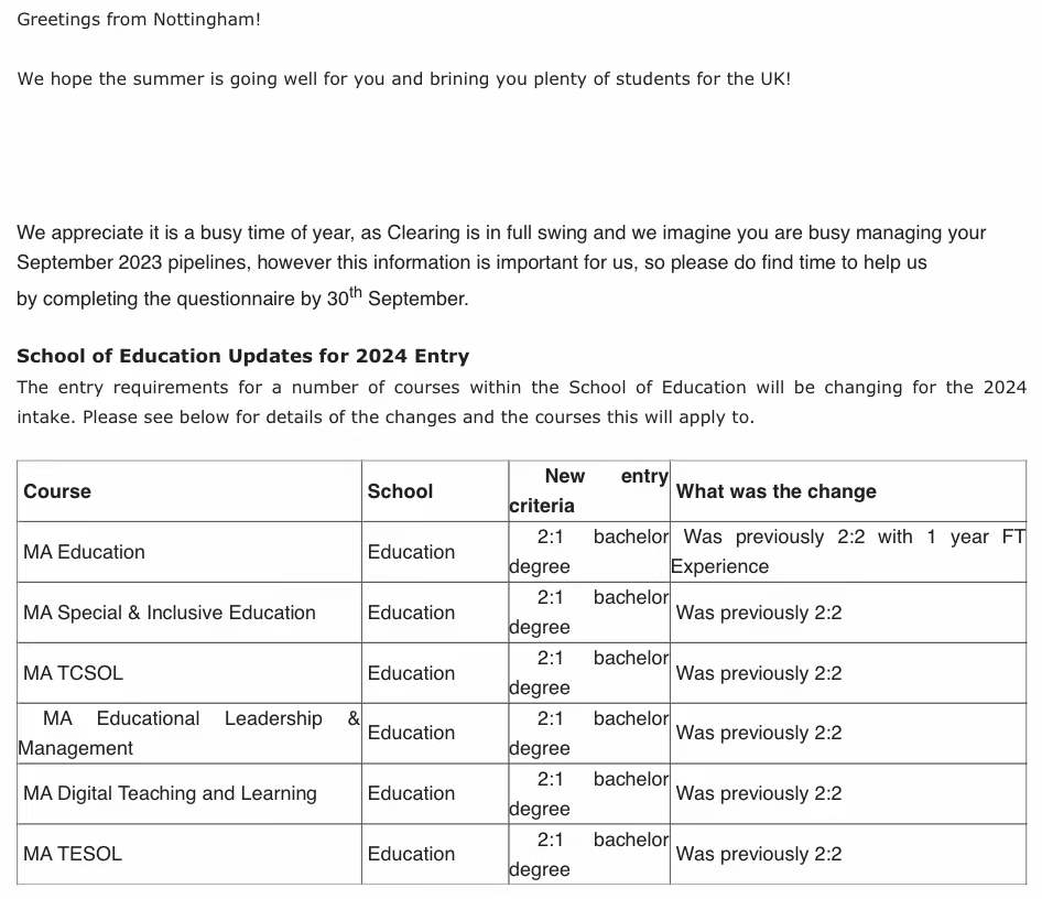 2024Fall诺丁汉大学教育学院整体提升录取标准,大部分对英国本地要求由2:2提升到2:1。中国成绩录取标准也会有相应的变动。