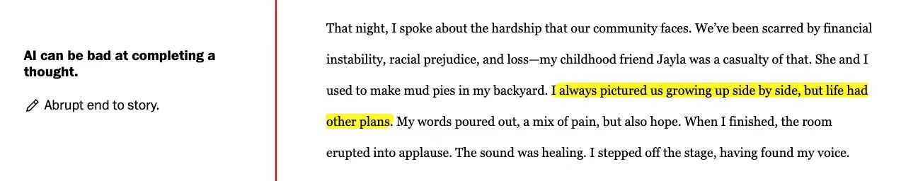 在此过程中发现 ChatGPT 撰写的文书的 弊端 :通常缺乏具体细节,导致文章缺乏支持其观点的证据。文笔平淡,用陈词滥调来解释情况,而不是深入探讨作者的情感经历。 这些文章往往是重复的、可预测的,让读者没有惊喜,也没有对作者的旅程有任何感觉。