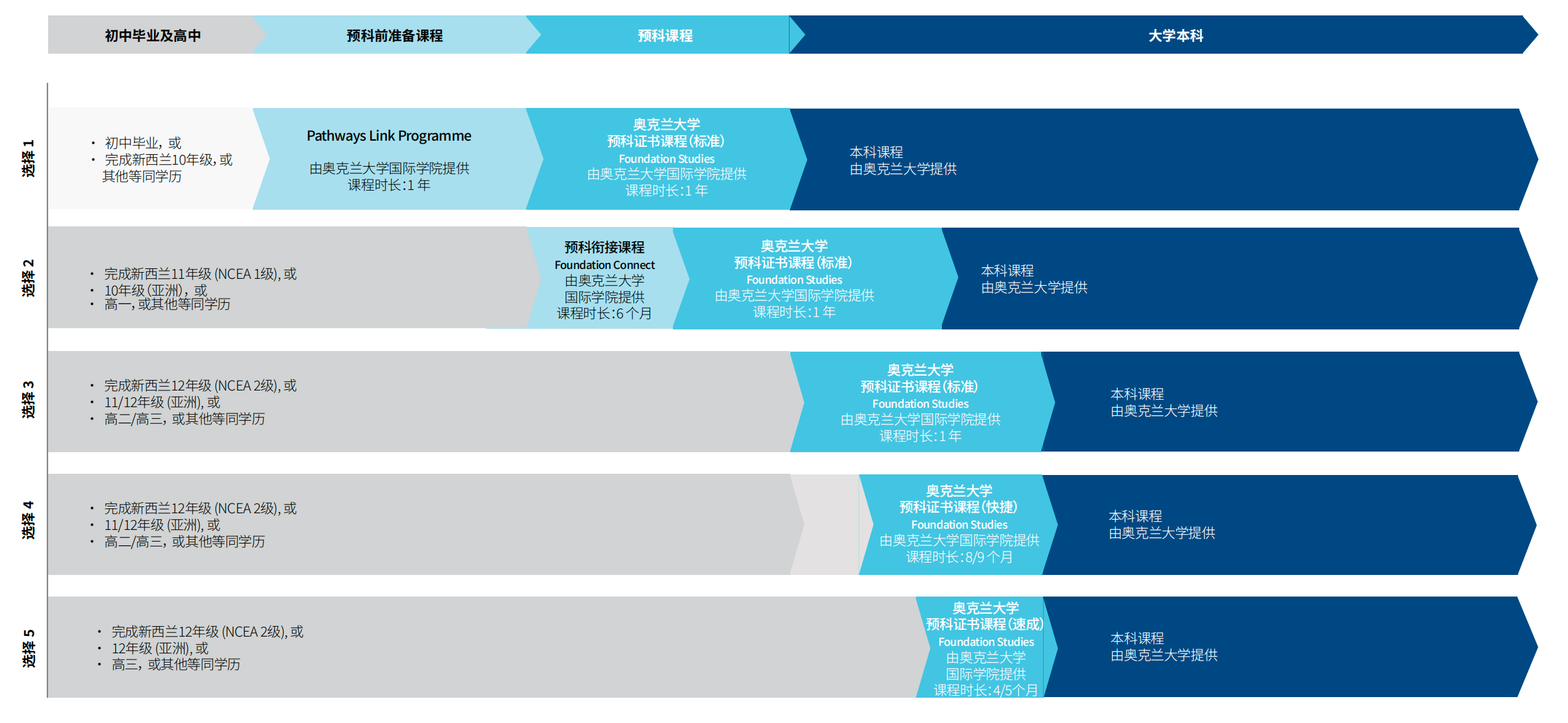 初中毕业:1 年 “Pathways Link Program”+1 年预科证书课程,2 年直达本科;