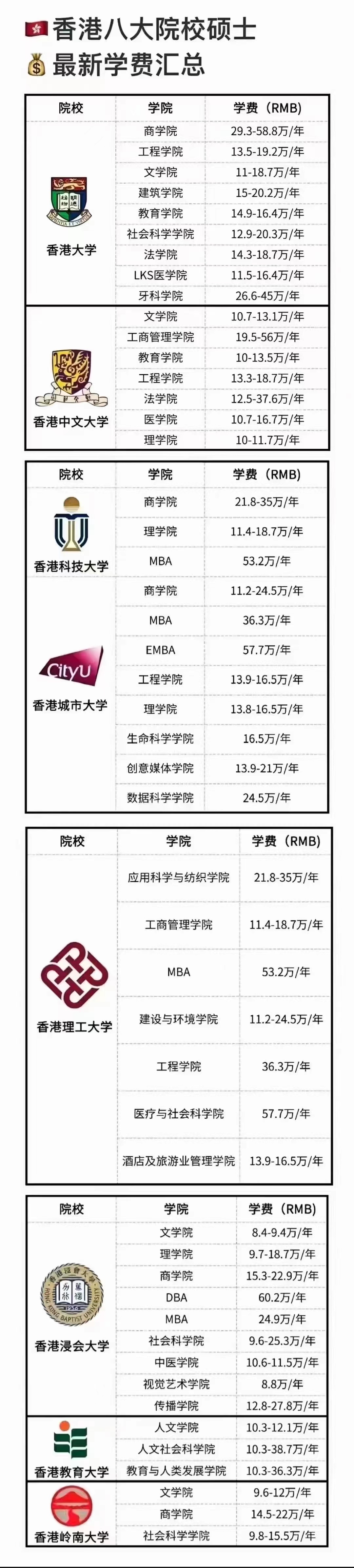 乘拾教育小编整理了香港八大院校(香港大学、香港中文大学、香港科技大学、香港城市大学、香港理工大学、香港浸会大学、香港教育大学、香港岭南大学)硕士研究生阶段各学院每年的学费。全文干货,可以根据自己的目标院校自行查看。