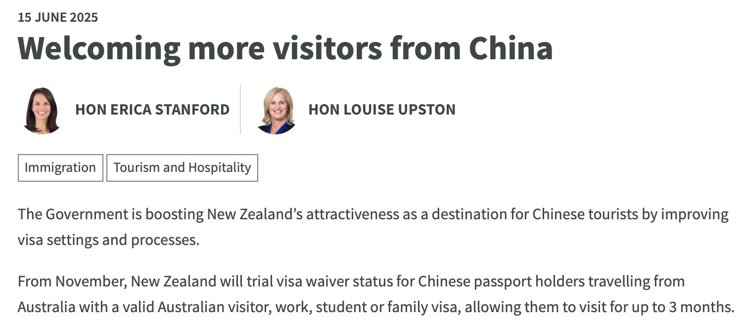 参考网站:https://www.1news.co.nz/2025/06/15/nz-to-launch-visa-waiver-trial-for-chinese-visitors-from-australia/