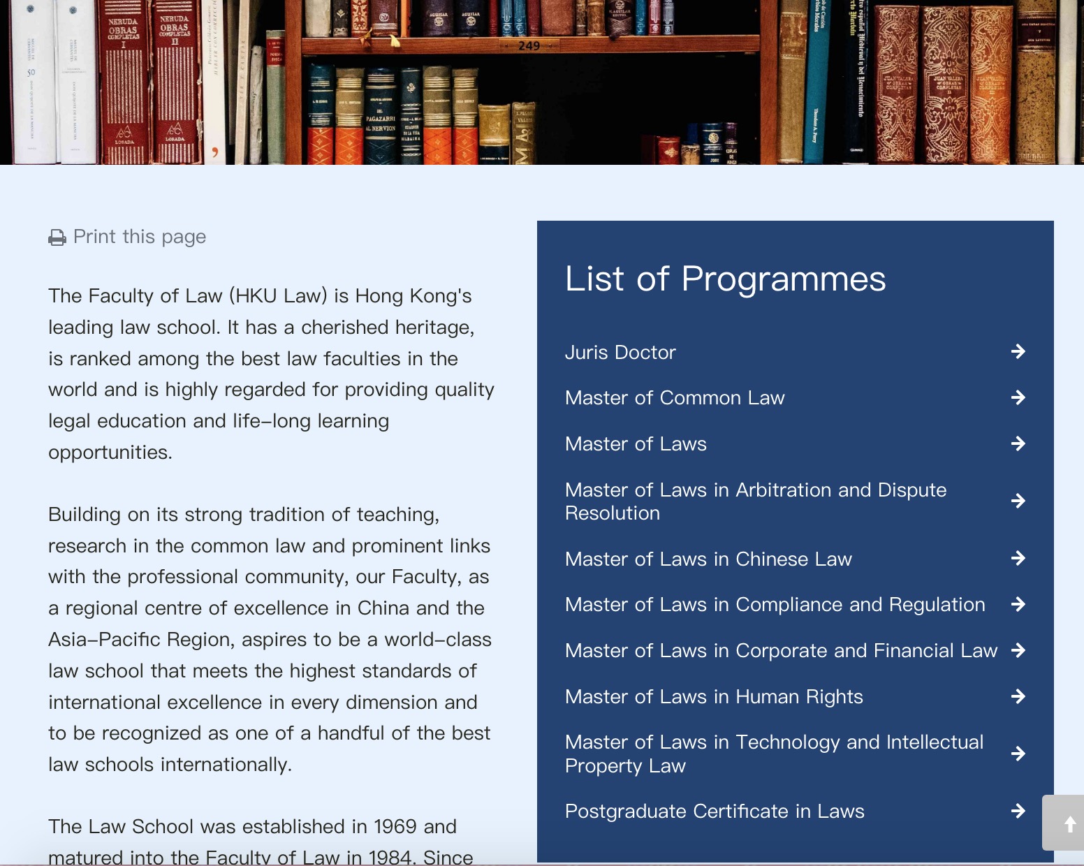 香港大学法学院是香港的第一个开设法学专业的地方,也是国际上最负盛名的法学院之一。凭借其在普通法领域的强大教学、研究传统,以及与专业界的突出联系,港大法学院在各个方面都达到国际卓越的最高标准,并被公认为国际上少数最好的法学院之一。