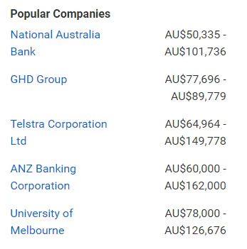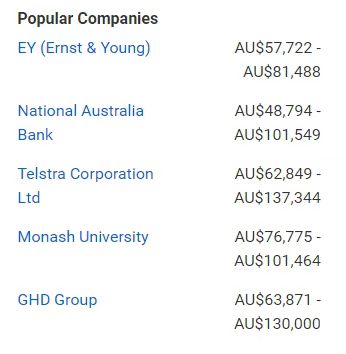 雇主公司 :澳大利亚国家银行 NAB ;澳新银行 ANZ ;安永会计师事务所; Telstra ; IBM ;