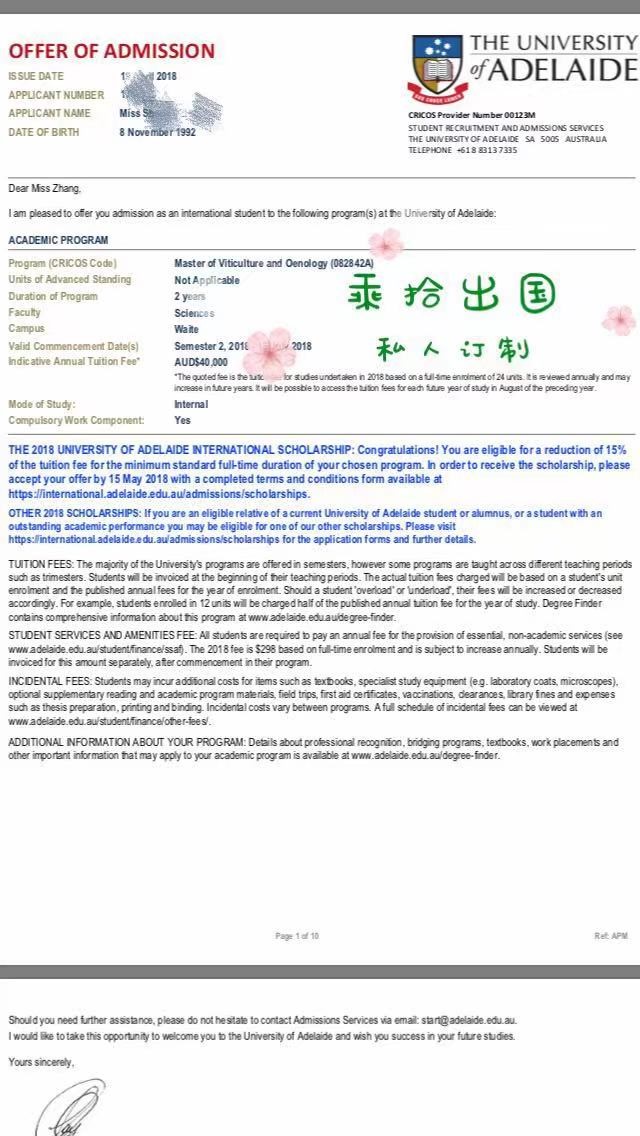 录取结果:成功拿到墨尔本大学、昆士兰大学和阿德莱德大学的offer(阿大获得奖学金)。
