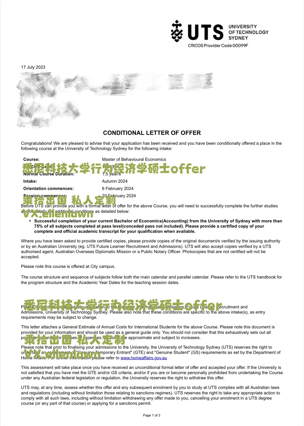 澳洲海本王同学成功获得悉尼科技大学offer