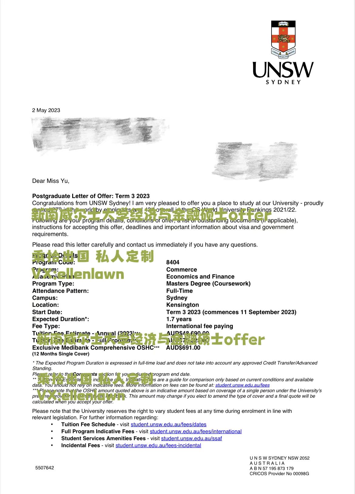 澳洲海本余同学成功获得新南威尔士大学offer