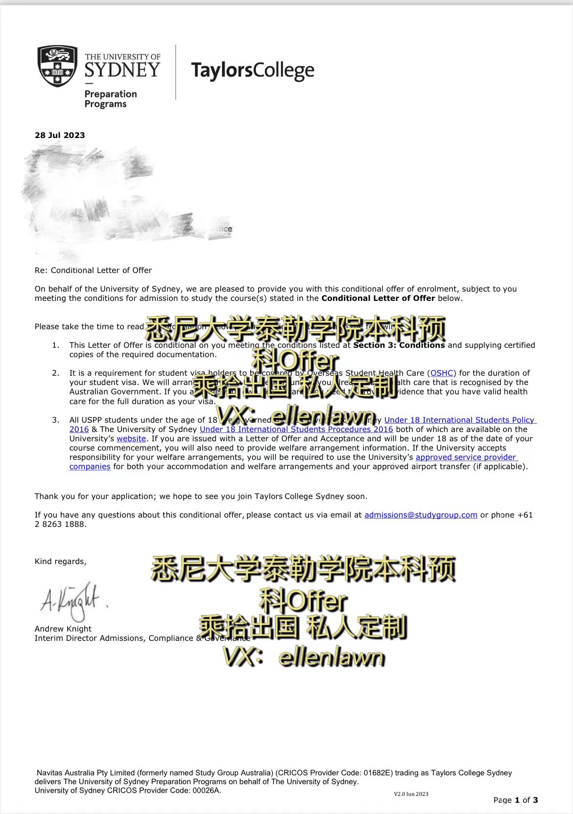 任同学获得悉尼大学泰勒学院本科预科offer