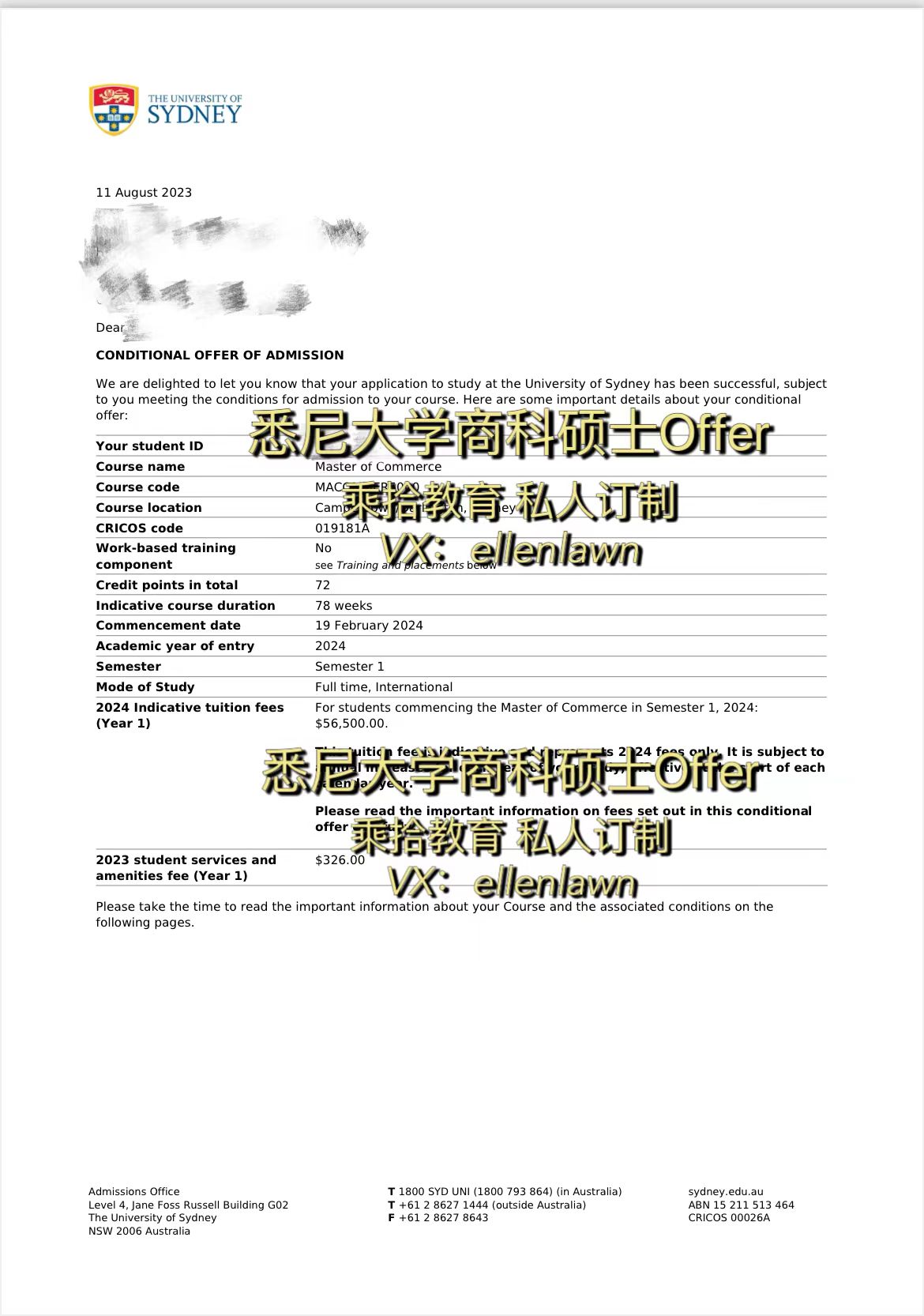 澳洲悉尼大学onshore王同学成功获得悉尼大学商科硕士offer