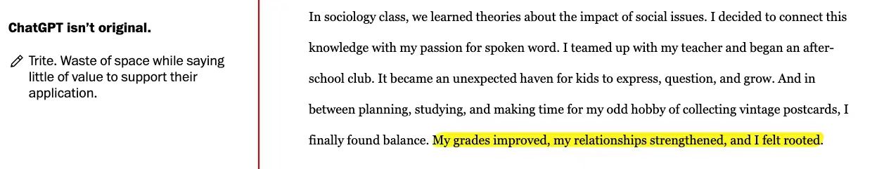 在此過程中髮現 ChatGPT 撰寫的文書的 弊端 :通常缺乏具體細節,導緻文章缺乏支持其觀點的證據。文筆平淡,用陳詞濫調來解釋情況,而不是深入探討作者的情感經歷。 這些文章往往是重覆的、可預測的,讓讀者沒有驚喜,也沒有對作者的旅程有任何感覺。